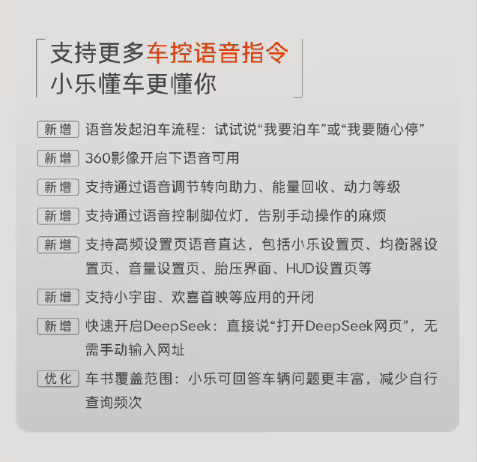 在智能車控方面,樂道汽車也進行了多項優化。新版本的系統增強了語音指令的功能,現在車主們可以通過語音發起泊車流程,在360度影像開啟的情況下也能使用語音控制,并且新增了快速開啟DeepSeek等實用功能,進一步提升了駕駛的智能化水平。