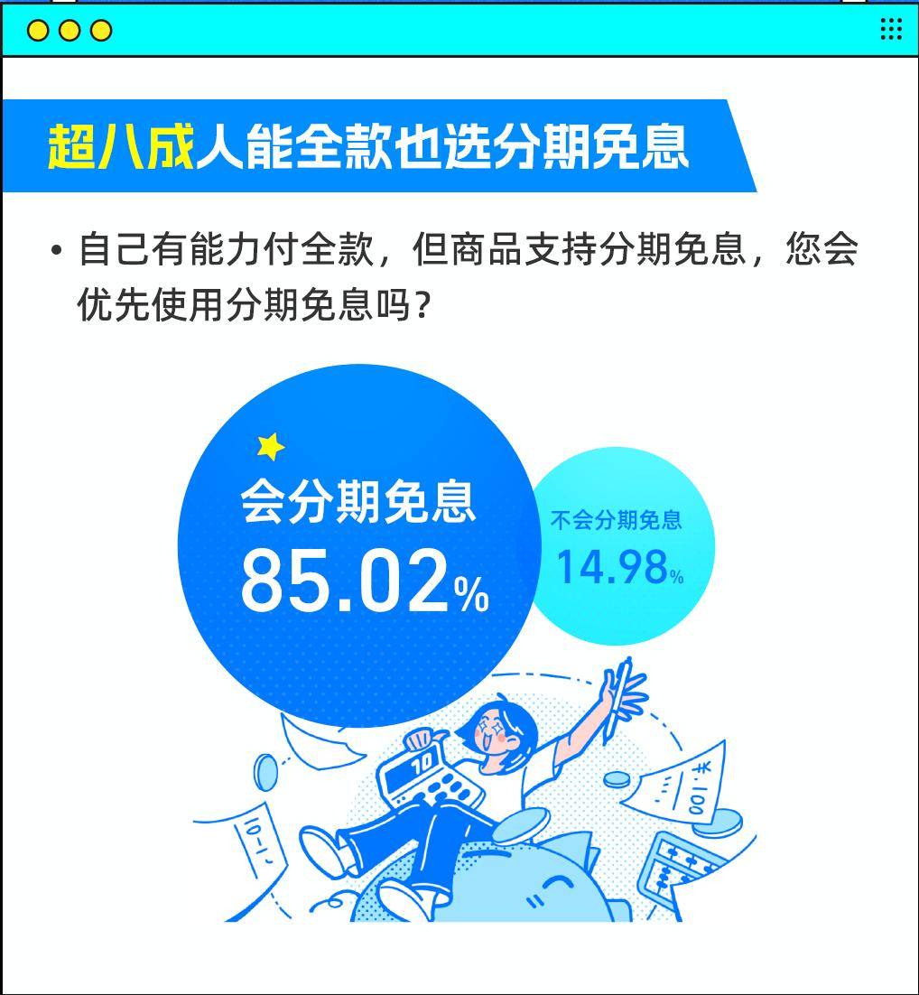 在眾多優惠措施中,分期免息成為了許多消費者的首選。這種方式不僅讓消費者在購物時能夠減輕經濟壓力,還能讓資金得到更有效的利用。新浪金融研究院最近發布的一份《分期消費習慣調研》顯示,有85%的消費者在有能力全款支付的情況下,只要商品支持分期免息,就會優先選擇分期免息付款。