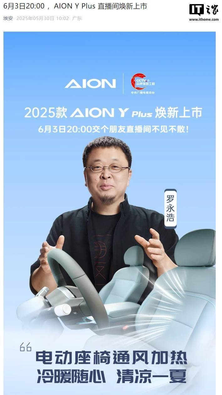羅永浩助陣!2025款廣汽埃安AION Y Plus 6月3日煥新直播上市