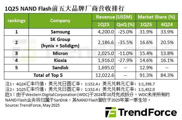 NAND閃存市場遇冷,2025年Q1原廠ASP環比降15%,美光反超鎧俠成季軍