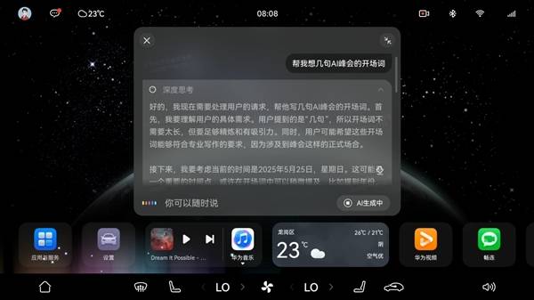 不僅如此,小藝還具備深度思考的能力。在面對(duì)復(fù)雜問題時(shí),如資訊總結(jié)、行情分析、行業(yè)報(bào)告生成等,小藝都能迅速給出高質(zhì)量的答案。這種能力使得座艙成為了一個(gè)移動(dòng)的知識(shí)中樞和決策智庫(kù),無(wú)論是商務(wù)人士還是普通用戶,都能從中受益。