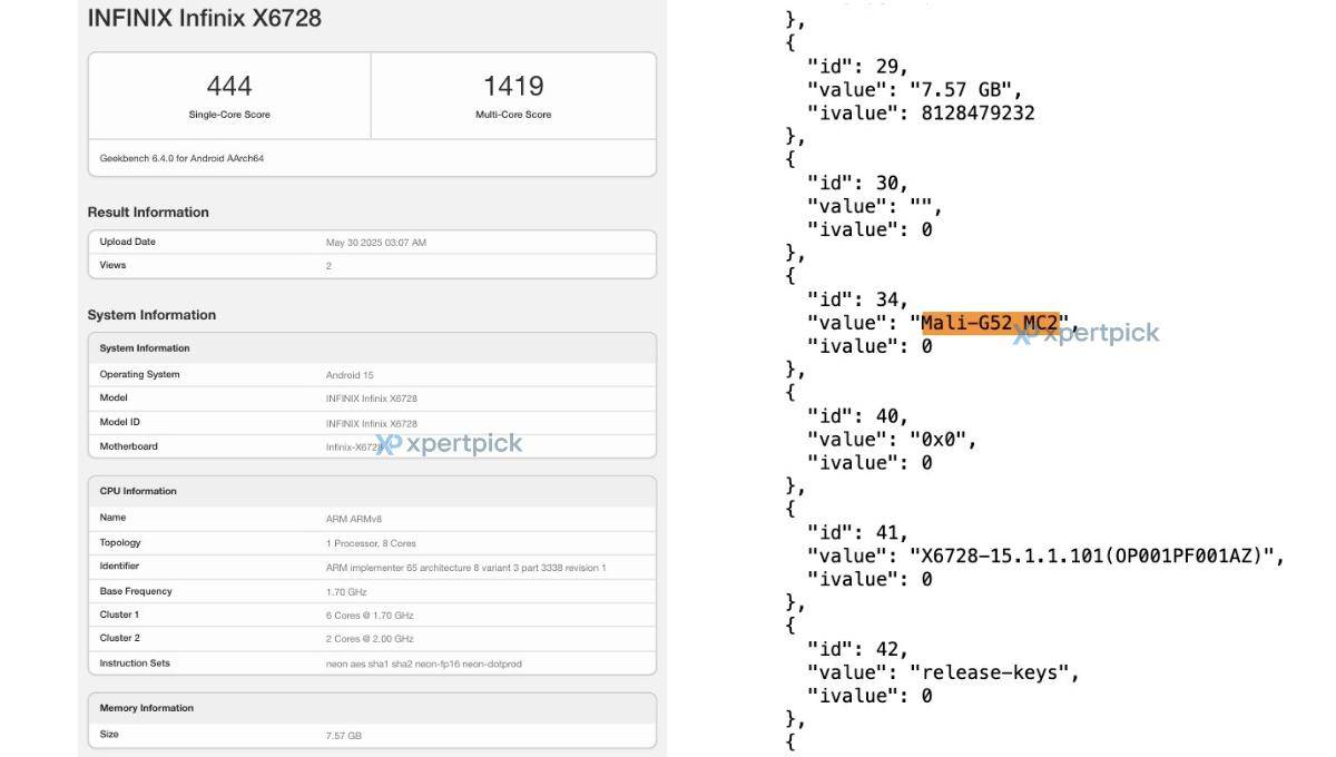 首先映入眼簾的是Infinix Hot 60i。據GeekBench頁面顯示,這款手機搭載了一顆八核處理器,其中兩個高性能核心的主頻達到2GHz,而其余六個核心的主頻則為1.70GHz。與之匹配的GPU是Mali-G52 MC2。這樣的配置組合,讓人聯想到聯發科Helio系列中的G85、G88或G91芯片,盡管具體型號尚需進一步確認。