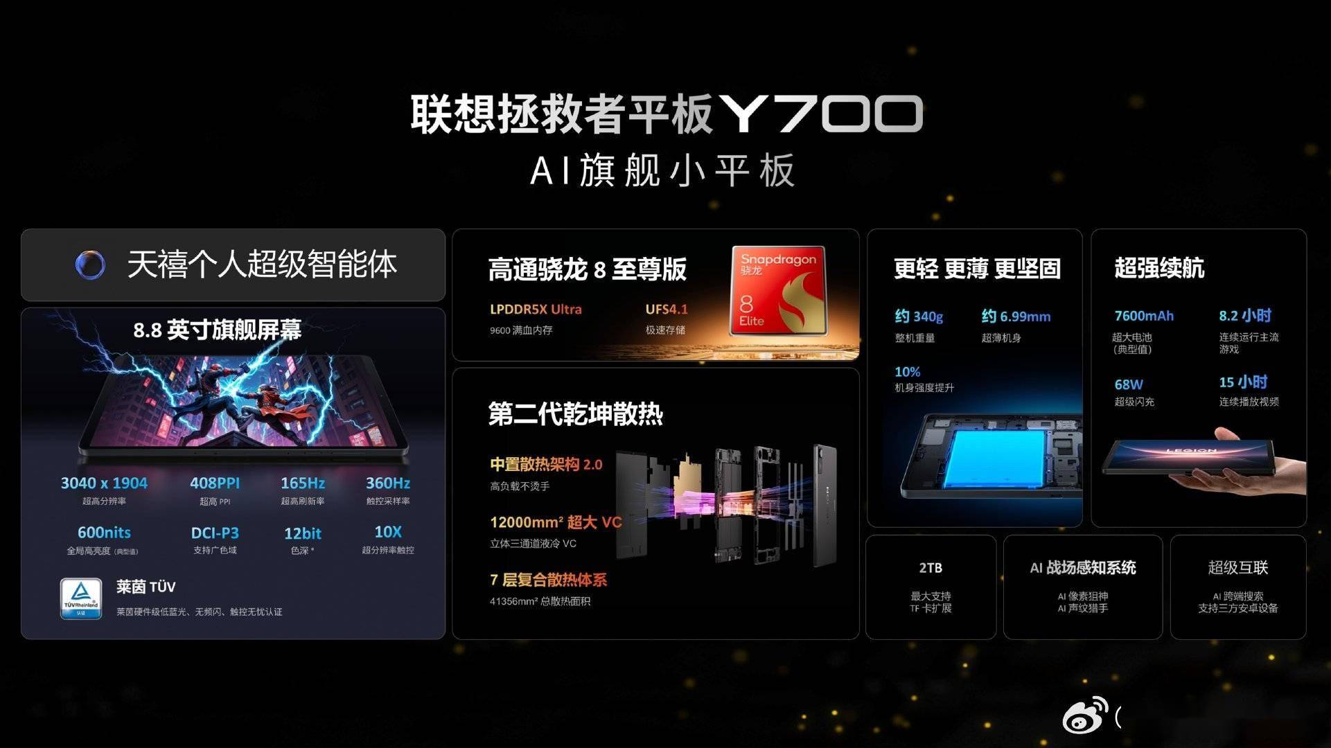 新款Y700平板在設計上也進行了諸多優化,機身更加窄小,屏占比更高,視覺效果更加出色。同時,采用了大面積VC均熱板,散熱性能更加強勁。續航方面,配備了7600mAh的大容量電池,滿足用戶長時間使用的需求。還配備了雙X軸線性馬達以及TF讀卡槽,最大支持2TB TF卡擴展,為用戶提供了更多的便利。