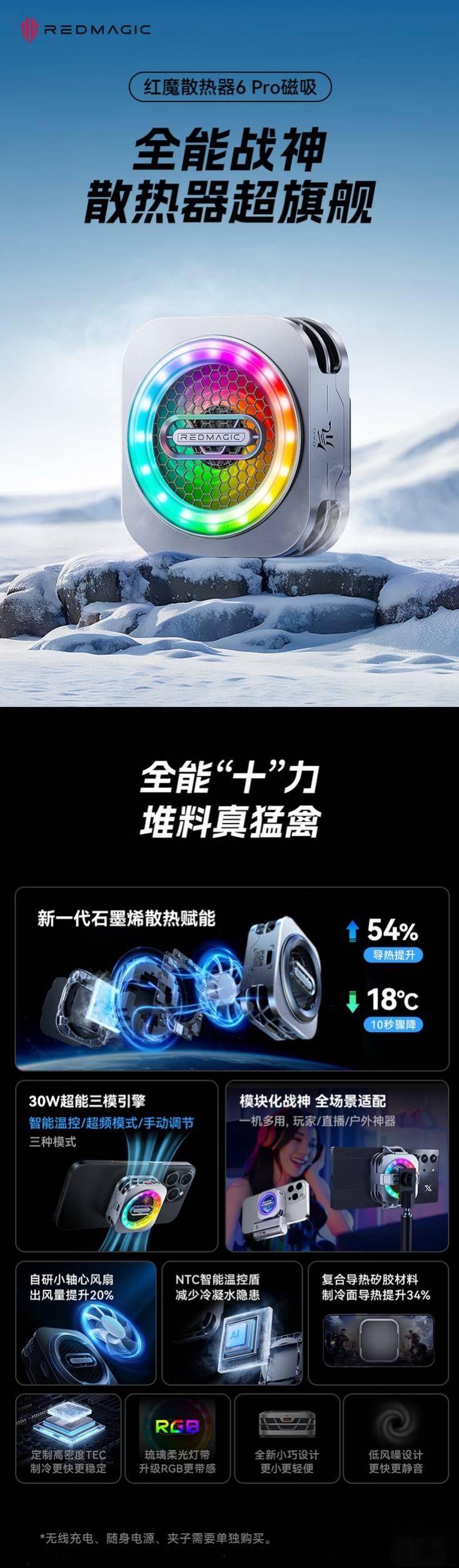 紅魔散熱器6 Pro自發(fā)布以來,憑借其出色的性能和設(shè)計贏得了玩家的青睞。它搭載了16顆RGB燈珠,內(nèi)置強大的14N磁力磁鐵,可以輕松吸附在具備磁吸功能的手機上,為玩家?guī)盱趴岬囊曈X效果和便捷的使用體驗。散熱器的峰值功率高達(dá)30W,配備了一個40x15mm的七葉風(fēng)扇,以及高密度TEC、3D貫穿式立體石墨烯散熱片、雙層復(fù)合導(dǎo)電硅膠和3D貫穿立體風(fēng)道,能夠有效降低手機溫度,最高降溫幅度可達(dá)41度。