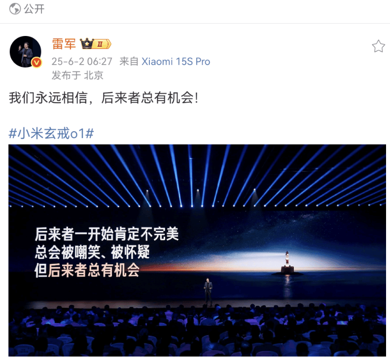 雷軍于6月2日清晨,在個人微博上發布了一條引人深思的言論:“我們始終堅信,后來者亦能綻放光彩!”