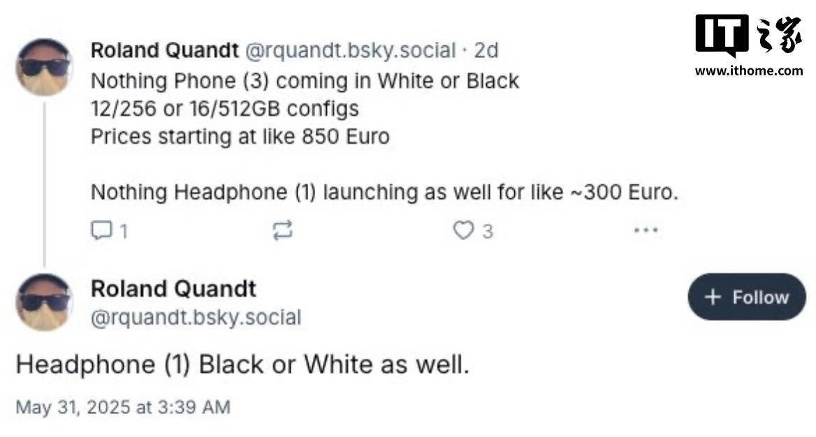 除了Nothing Phone(3)之外,Roland Quandt還透露Nothing公司將推出一款名為Nothing Headphone(1)的頭戴式耳機。這款耳機同樣提供黑白雙色可選,價格相對親民,約為300歐元(約合人民幣2452元)。這一消息的發布,無疑為音頻愛好者們帶來了新的期待。