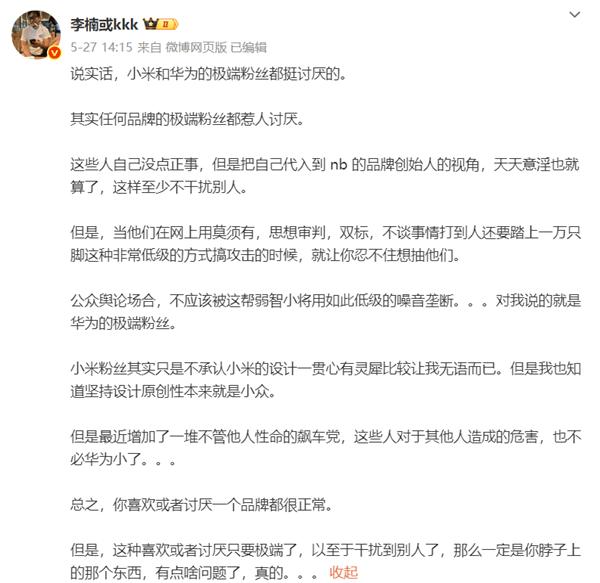 事實上,這并非李楠首次就這一話題發聲。早在上個月,他就已公開表達過對小米和華為極端粉絲的不滿。他認為,無論是哪個品牌的極端粉絲,其行為都令人不悅,且這種極端行為在所有品牌中都存在。