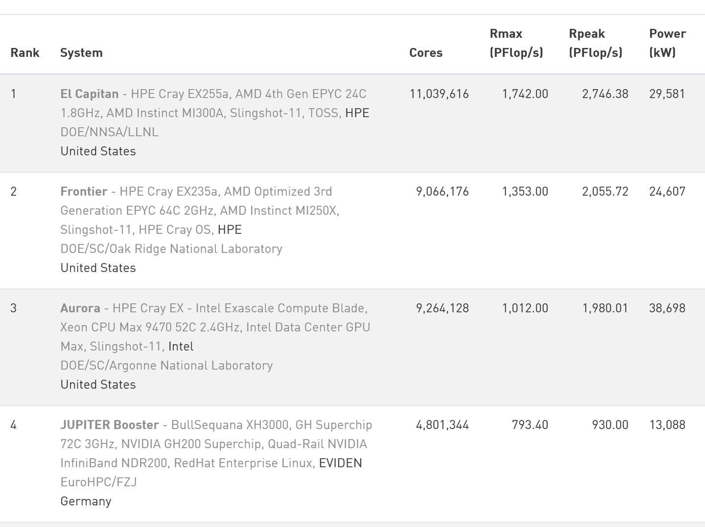 在本次榜單中,前三甲的寶座依然穩(wěn)固,由El Capitan、Frontier和Aurora三臺(tái)E級(jí)超算牢牢占據(jù),展現(xiàn)了它們?cè)诟咝阅苡?jì)算領(lǐng)域的卓越實(shí)力。而令人矚目的是,德國(guó)JUPITER超級(jí)計(jì)算機(jī)的調(diào)試系統(tǒng)JUPITER Booster異軍突起,成功躋身第四名,將原先排名第四至第九的超算依次擠后一位。