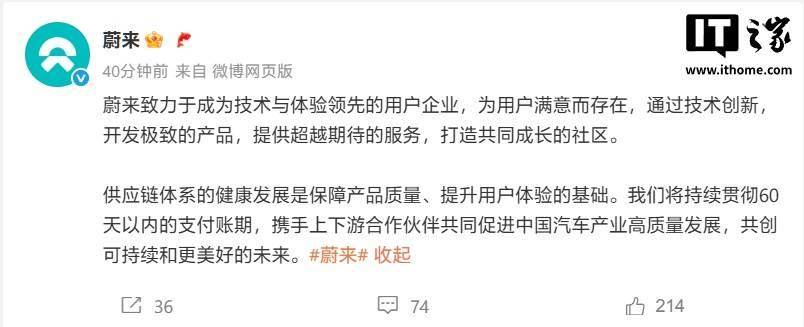 近日,蔚來汽車在其官方微博上宣布了一項(xiàng)重要決策,承諾將堅持在60天內(nèi)完成供應(yīng)商款項(xiàng)的支付,旨在攜手產(chǎn)業(yè)鏈上下游的合作伙伴,共同推動中國汽車產(chǎn)業(yè)邁向高質(zhì)量發(fā)展的新階段。