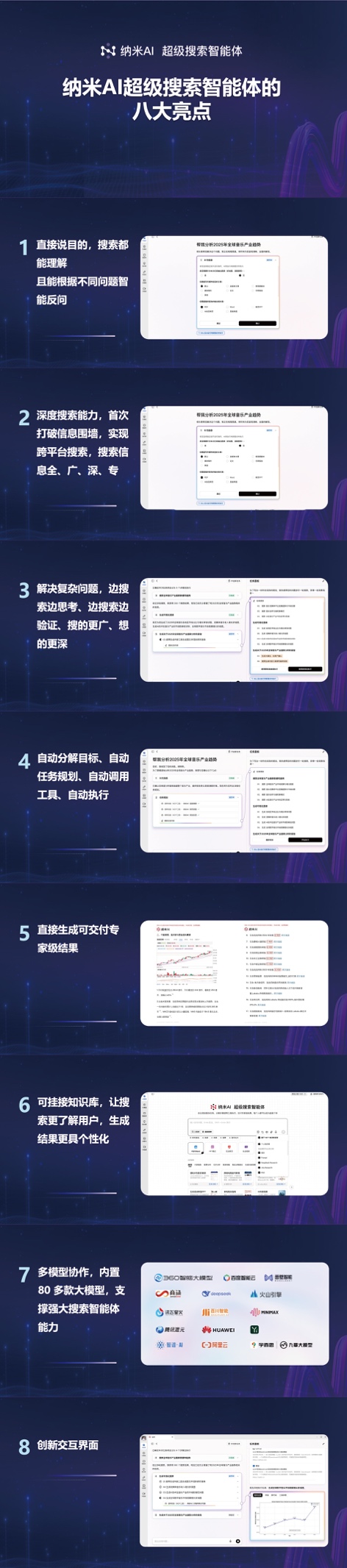 據(jù)介紹,納米AI超級(jí)搜索智能體的八大核心亮點(diǎn)包括: