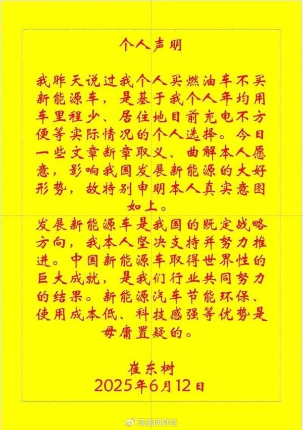 然而,這一言論隨即引發了廣泛的爭議。為了澄清自己的觀點,崔東樹在朋友圈中進行了回應。他表示,自己選擇購買燃油車是基于個人實際情況的考慮,包括年均用車里程較少以及居住地充電設施不便等因素。他強調,部分文章對他的言論進行了斷章取義和曲解,這對他個人以及我國新能源車的良好發展形勢都造成了不良影響。