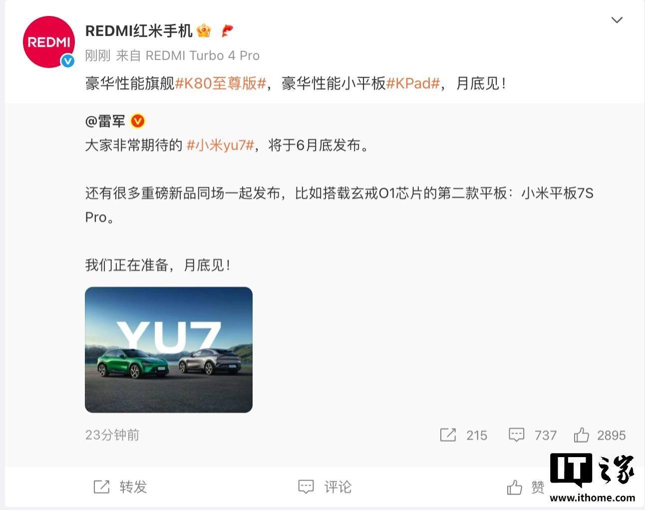 近日,小米集團及其子品牌REDMI相繼宣布了多款新品即將發布的消息,引發了科技愛好者的廣泛關注。雷軍在個人平臺上率先預告,小米YU7系列與搭載玄戒O1芯片的小米平板7S Pro將于本月末震撼登場。緊接著,REDMI官方賬號也傳來捷報,豪華性能旗艦K80至尊版手機與REDMI KPad小平板同樣定于月底面世。