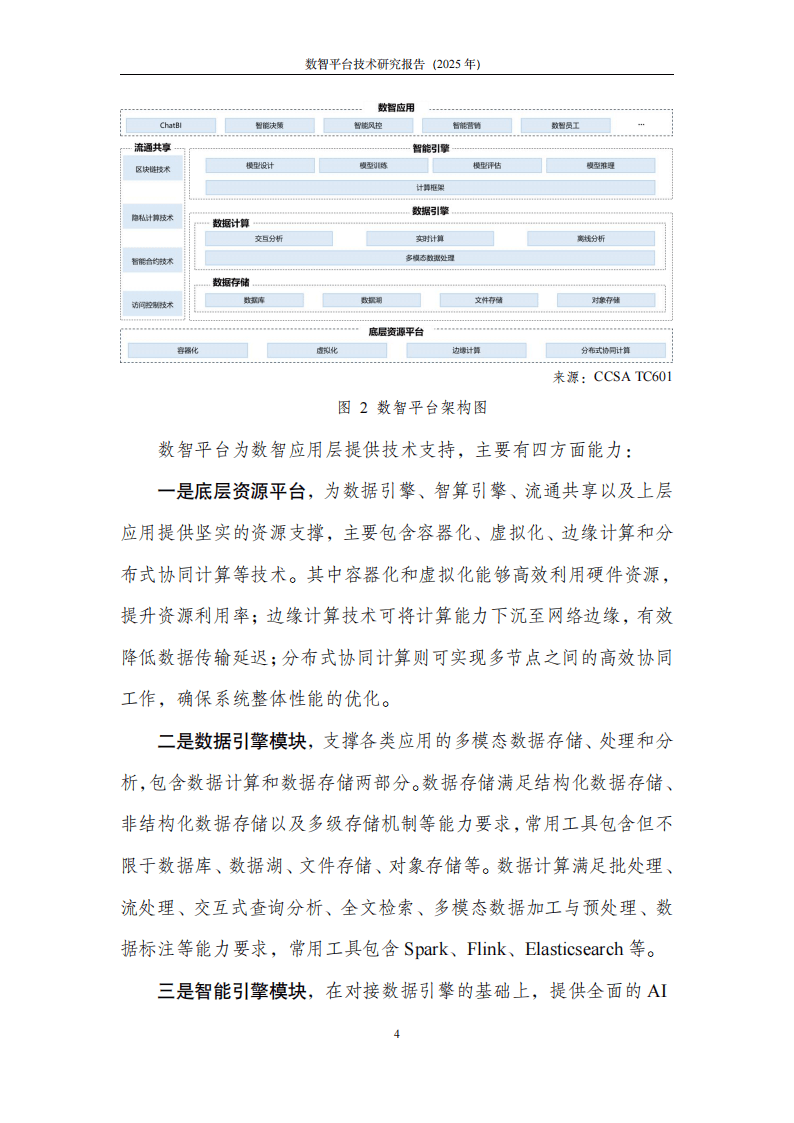 數(shù)智平臺基于大數(shù)據(jù)、云計算和人工智能技術(shù)構(gòu)建,具備底層資源平臺、數(shù)據(jù)引擎模塊、智能引擎模塊和流通共享模塊四大核心能力。這些能力為數(shù)智應(yīng)用層,如ChatBI、智能客服等,提供了堅實的技術(shù)基礎(chǔ),成為釋放數(shù)據(jù)價值的關(guān)鍵環(huán)節(jié)。數(shù)智平臺的建設(shè)不僅整合了企業(yè)內(nèi)外部數(shù)據(jù)資源,打破了信息孤島,還提升了企業(yè)從數(shù)據(jù)到?jīng)Q策的效率,促進了業(yè)務(wù)流程的優(yōu)化和創(chuàng)新。