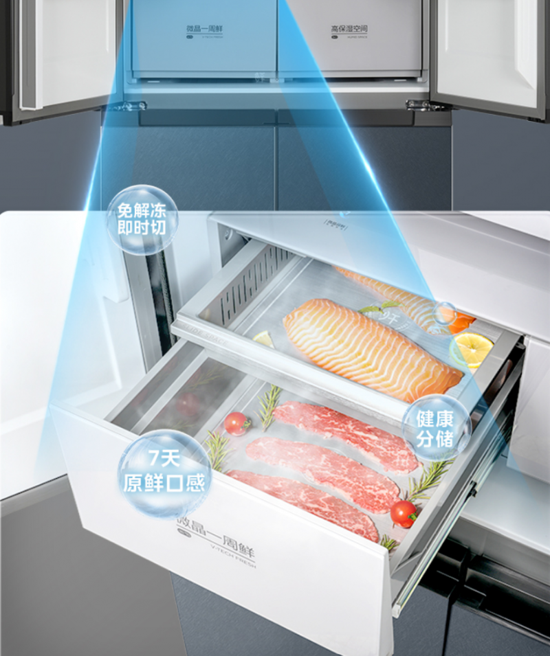 與此同時,在消費者最為關心的食物保鮮方面,美的冰箱也擁有許多卓越的創新技術。由毫秒級雷達感溫與雙循環獨立送風系統所組成的微晶一周鮮技術,突破了傳統食物保鮮的局限。當冰箱內溫度發生了變化就能迅速作出調節,實現溫度與風量的雙重精準把控。儲存在冰箱內的食材,表面所形成的冰晶極其微小,僅為一根頭發絲1%的大小,讓食物在不會被凍結的情況下,也能鎖住原鮮,肉類、魚類等高蛋白食材可實現長達7天的鮮嫩狀態,為用戶帶來“取即切、切即烹”的高效廚房體驗。