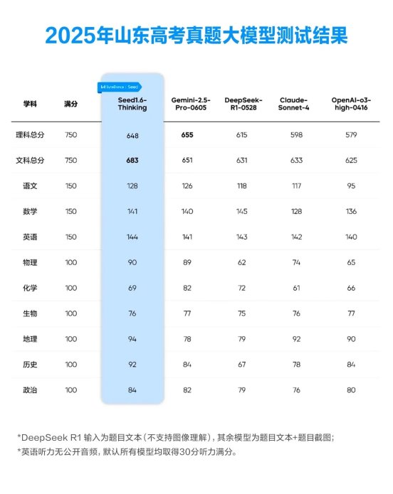 日前,字節跳動Seed團隊公布2025高考全科測試結果。該測試采用全國新一卷和山東省自主命題,豆包Seed1.6-Thinking模型的文科和理科成績分別達到683分和648分。在同期測試的國內外5款頂級模型中,豆包文科成績獲最高分,理科僅次于谷歌Gemini 2.5 Pro,后者成績為655分。