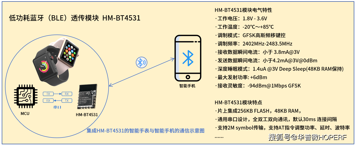 以華普微自主研發(fā)的HM-BT4531為例,這是一款通過(guò)BQB認(rèn)證,采用智能干擾消除技術(shù),可優(yōu)化藍(lán)牙設(shè)備連接穩(wěn)定性的低功耗、高性能BLE模塊。HM-BT4531基于新一代藍(lán)牙5.2芯片,集成先進(jìn)的BLE射頻收發(fā)器,支持無(wú)線數(shù)據(jù)透?jìng)鞴δ堋Mㄟ^(guò)與外部MCU通信,HM-BT4531可以快速實(shí)現(xiàn)BLE從設(shè)備與手機(jī)、平板等BLE主設(shè)備的無(wú)線連接和數(shù)據(jù)通信。用戶數(shù)據(jù)格式可由上層應(yīng)用程序自行定義,移動(dòng)設(shè)備可以通過(guò)APP對(duì)模塊進(jìn)行寫操作,實(shí)現(xiàn)數(shù)據(jù)的靈活傳輸。