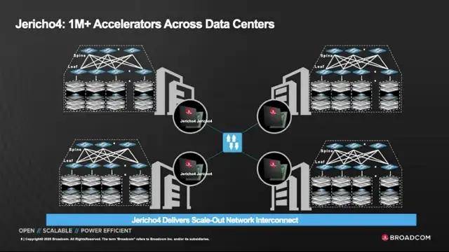 在AI時代,分布式計算環境對網絡解決方案提出了更高要求。Ram Velaga強調,Jericho4系列旨在構建一個能夠超越單個數據中心邊界的AI規模以太網交換架構。它支持長距離RoCE傳輸、先進的擁塞控制和高效的互連,使得超過一百萬個加速器(如GPU和TPU)能夠無縫協作。