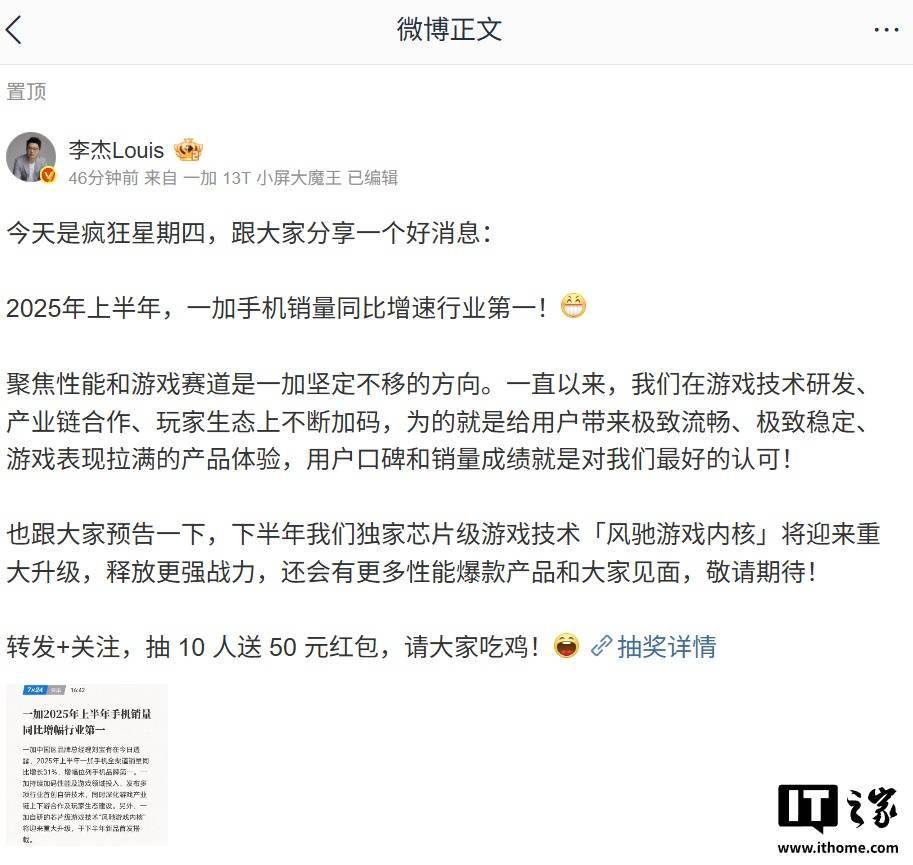 一加2025上半年手機銷量增速領跑全行業,劉寶有透露將持續加碼性能游戲領域