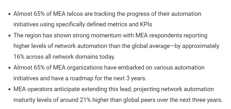 傳統觀念中,歐美地區往往被視為電信網絡自動化的領頭羊,但此次報告的數據卻顛覆了這一認知。深入分析報告內容,我們發現MEA地區電信運營商在網絡自動化方面的積極作為并非偶然。該地區近65%的電信公司已采用特定指標來追蹤自動化進展,超過半數的公司更是制定了未來三年的詳細發展路線圖。