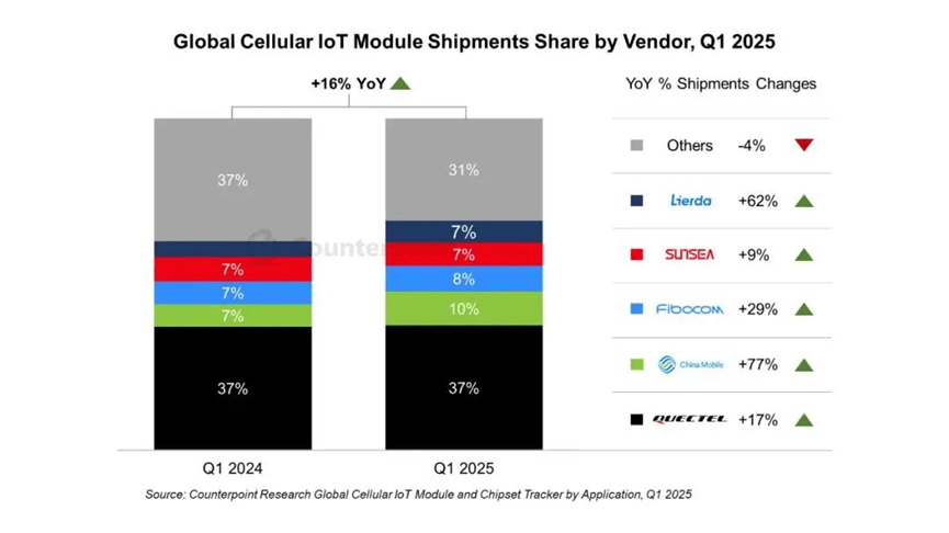 最新研究顯示,到2024年,亞太地區將貢獻全球超過67%的物聯網模組出貨量,物聯網連接數占比更是高達80%。其中,中國在全球模組出貨量上占據絕對領先地位。2025年第一季度,全球蜂窩物聯網模組出貨量前五名均被中國企業占據,包括移遠通信、中國移動、廣和通、日海智能和利爾達,這些企業合計占據了全球69%的市場份額。若將其他中國企業的占比納入統計,中國在全球市場的總占比將達到驚人的80%。