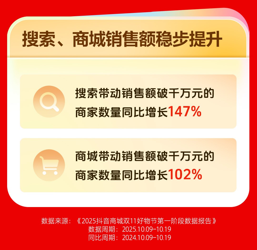 抖音電商貨架場景同樣表現強勁,是商家長期經營的重要陣地。數據顯示,10月9日至10月19日,搜索和商城表現突出,搜索帶動銷售額破千萬元的商家數量同比增長147%,商城帶動銷售額破千萬元的商家數量同比增長102%。