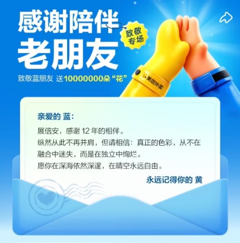 美團外賣官方今日發布一條微博,內容稱“再見了,陪伴我們12年的藍朋友”,并附上主題為“感謝陪伴老朋友”的頁面。而美團外賣APP同樣也上線了“永遠記得你的黃”署名的感謝信,同時設置“致敬藍朋友”入口,用戶可通過搜索關鍵詞“藍朋友”領取“送給藍朋友的花兌換券”。官方信息顯示,此次活動周期為11月14日至21日,共計準備1000萬份兌換券,部分可兌換玫瑰鮮花、桂花糕、花餅等各種含有花字的商品。