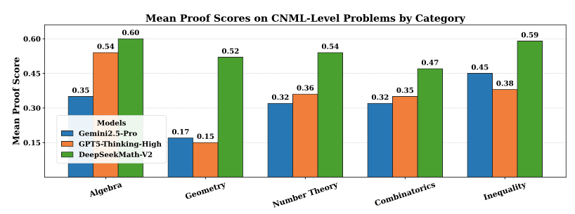 在與頂級(jí)模型的直接對(duì)比中,DeepSeekMath-V2在所有CNML級(jí)別問題類別上,包括代數(shù)、幾何、數(shù)論、組合學(xué)和不等式均持續(xù)優(yōu)于GPT-5-Thinking-High和Gemini 2.5-Pro。