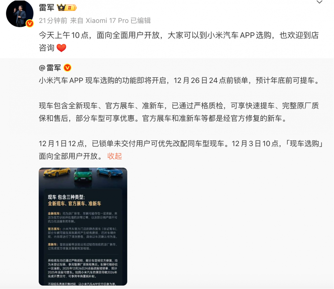 12月3日消息,今日,小米集團創始人、董事長雷軍發微博表示,小米汽車APP現車選購功能,今早10點,面向全部用戶開放。