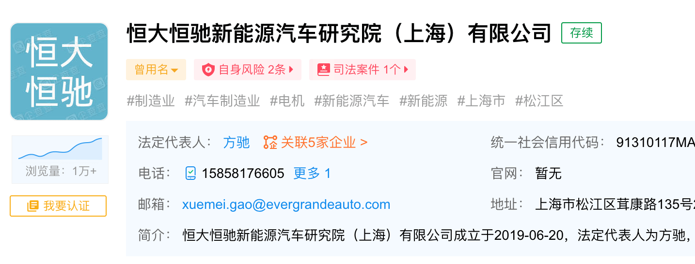 資料顯示,恒大恒馳新能源汽車研究院(上海)有限公司成立于 2019 年 6 月,法定代表人為方馳,經營范圍包括貨物進出口;技術進出口;新能源汽車整車、智能產品的生產、銷售等,由恒大新能源汽車投資控股集團有限公司全資持股。