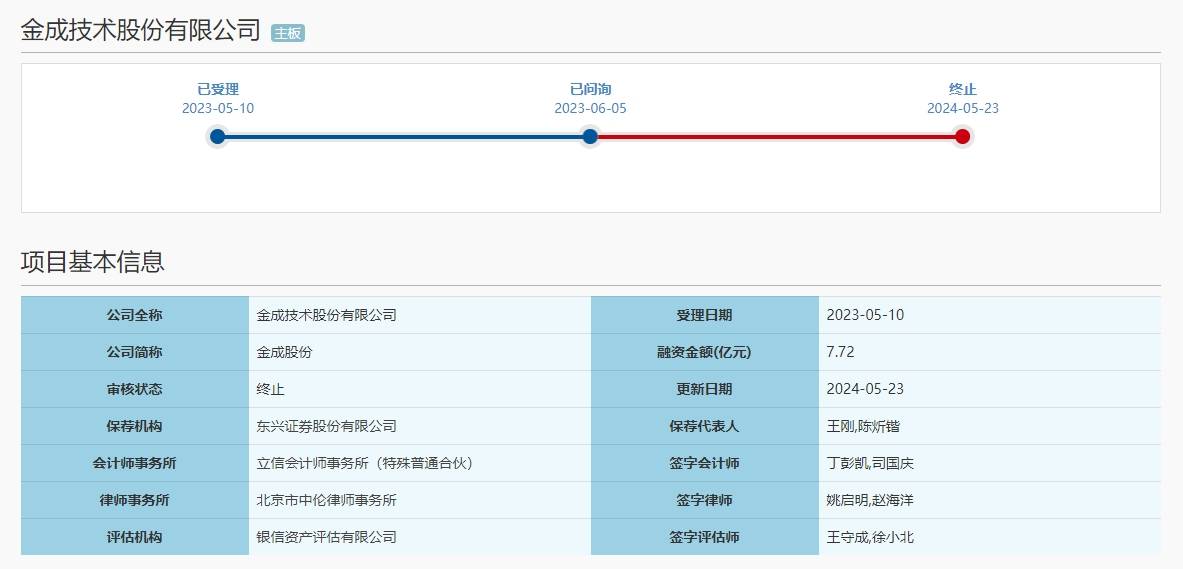 5月23日,上交所官網顯示,因金成技術股份有限公司(下稱“金成股份”)及其保薦人撤回發行上市申請,根據有關規定,上交所決定終止其主板發行上市審核。