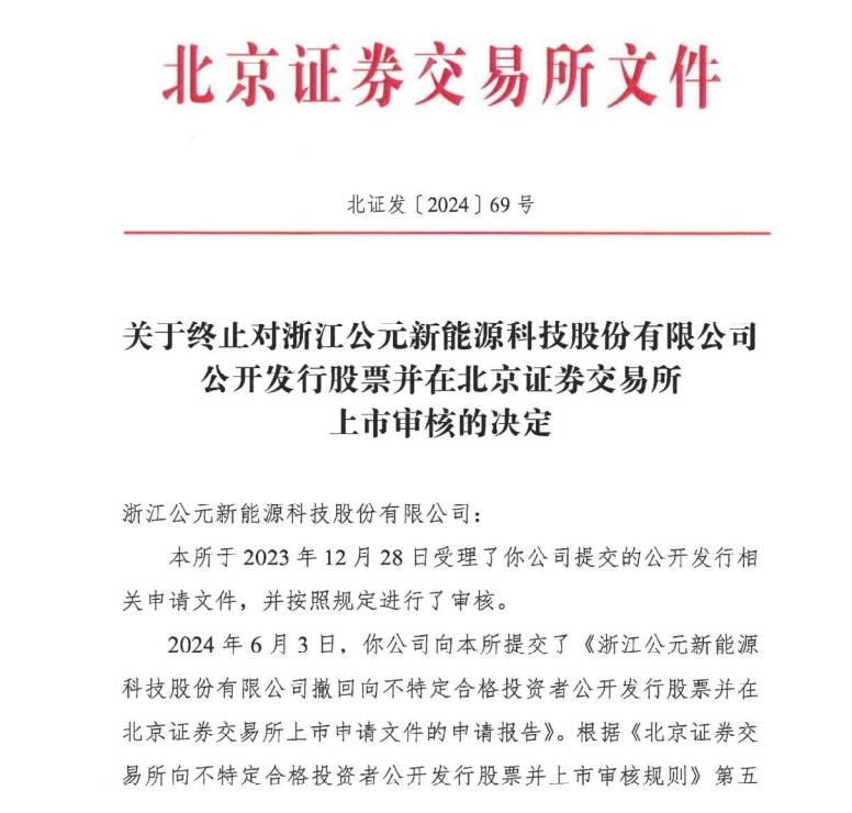 6月24日,北交所官網顯示,因浙江公元新能源科技股份有限公司(下稱“公元新能”)及其保薦人撤回發行上市申請,根據有關規定,北交所終止其IPO審核,保薦機構為浙商證券。