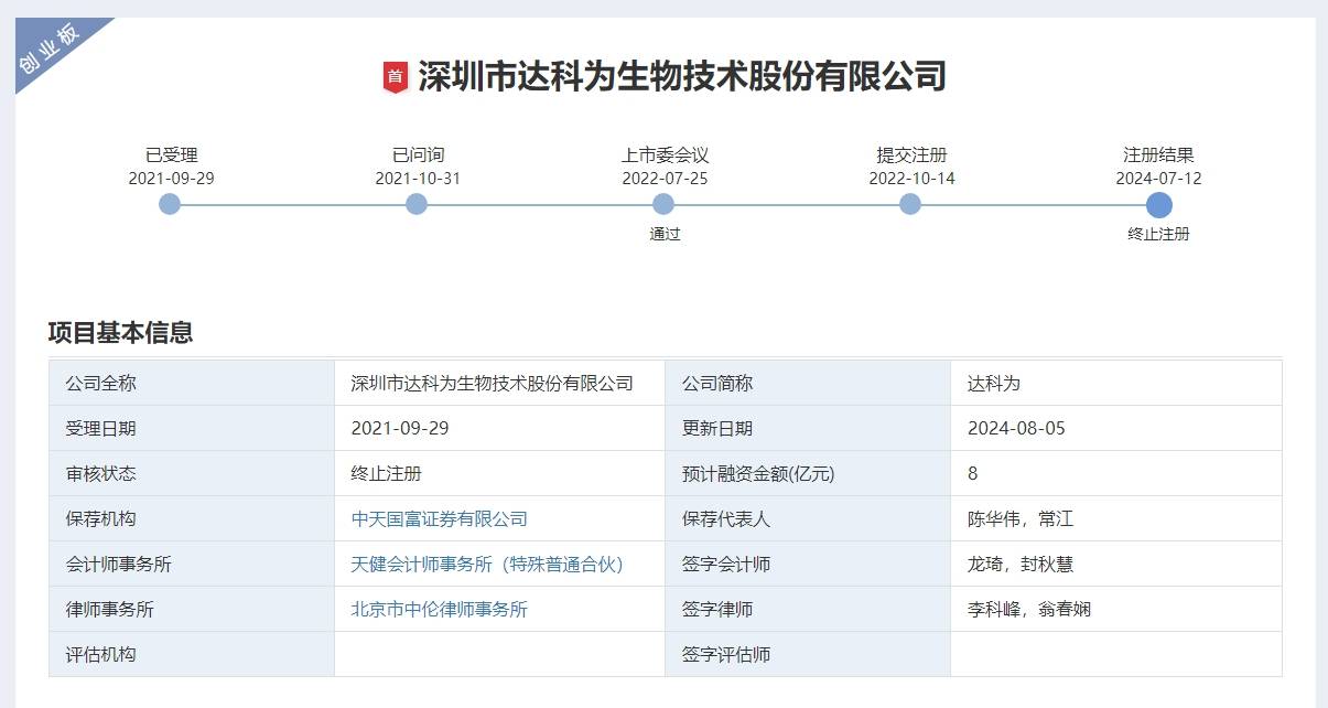 8月5日,深交所官網顯示,因深圳市達科為生物技術股份有限公司(下稱“達科為”)及其保薦人中天國富證券主動撤回注冊申請文件,根據有關規定,深交所決定終止其創業板IPO審核。