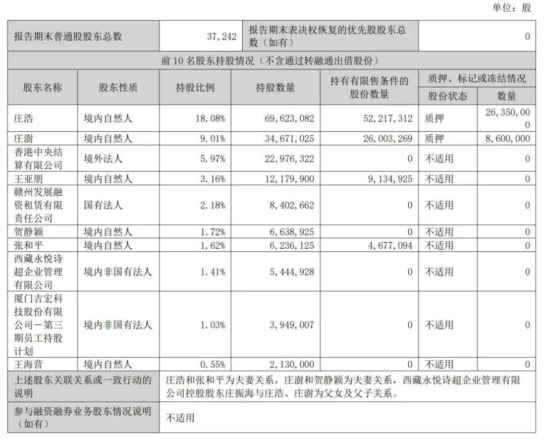 截至2024年6月30日,莊浩女士持股為18.08%,莊澍持股為9.01%,香港中央結算有限公司持股為5.97%,王亞朋持股為3.16%,贛州發展融資租賃有限責任公司持股為2.18%,賀靜穎持股為1.72%;