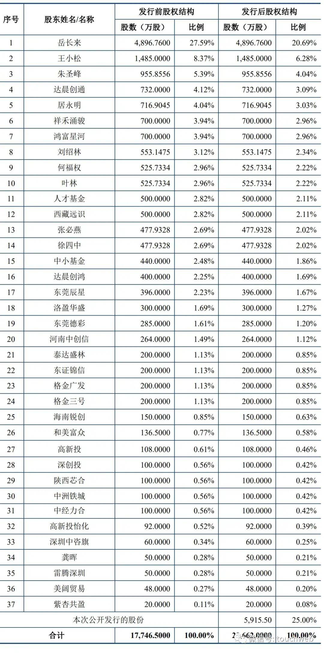岳長來持股為27.59%,王小松持股為8.37%,朱圣峰持股為5.39%,達晨創通持股為4.12%,居永明持股為4.04%,祥禾涌駿、鴻富星河分別持股為3.94%,劉紹林持股為3.12%,何福權、葉林分別持股為2.96%,人才基金、西藏遠識分別持股為2.82%;