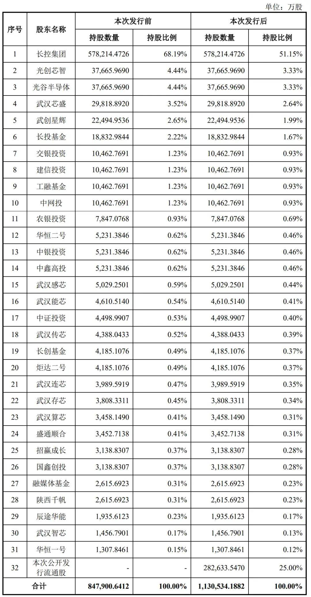 IPO后,長控集團(tuán)持股為51.15%,光創(chuàng)芯智、光谷半導(dǎo)體分別持股為3.33%,武漢芯盛持股為2.64%,武創(chuàng)星輝持股為1.99%,長投基金持股為1.67%,交銀投資、建信投資、工融基金、中網(wǎng)投分別持股為0.93%,農(nóng)銀投資持股為0.69%;