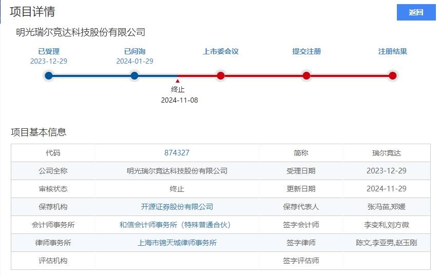 近日,北交所官網顯示,因明光瑞爾競達科技股份有限公司(以下簡稱“瑞爾競達”)主動撤回上市申請,根據有關規定,北交所決定終止其IPO審核,保薦機構為開源證券。