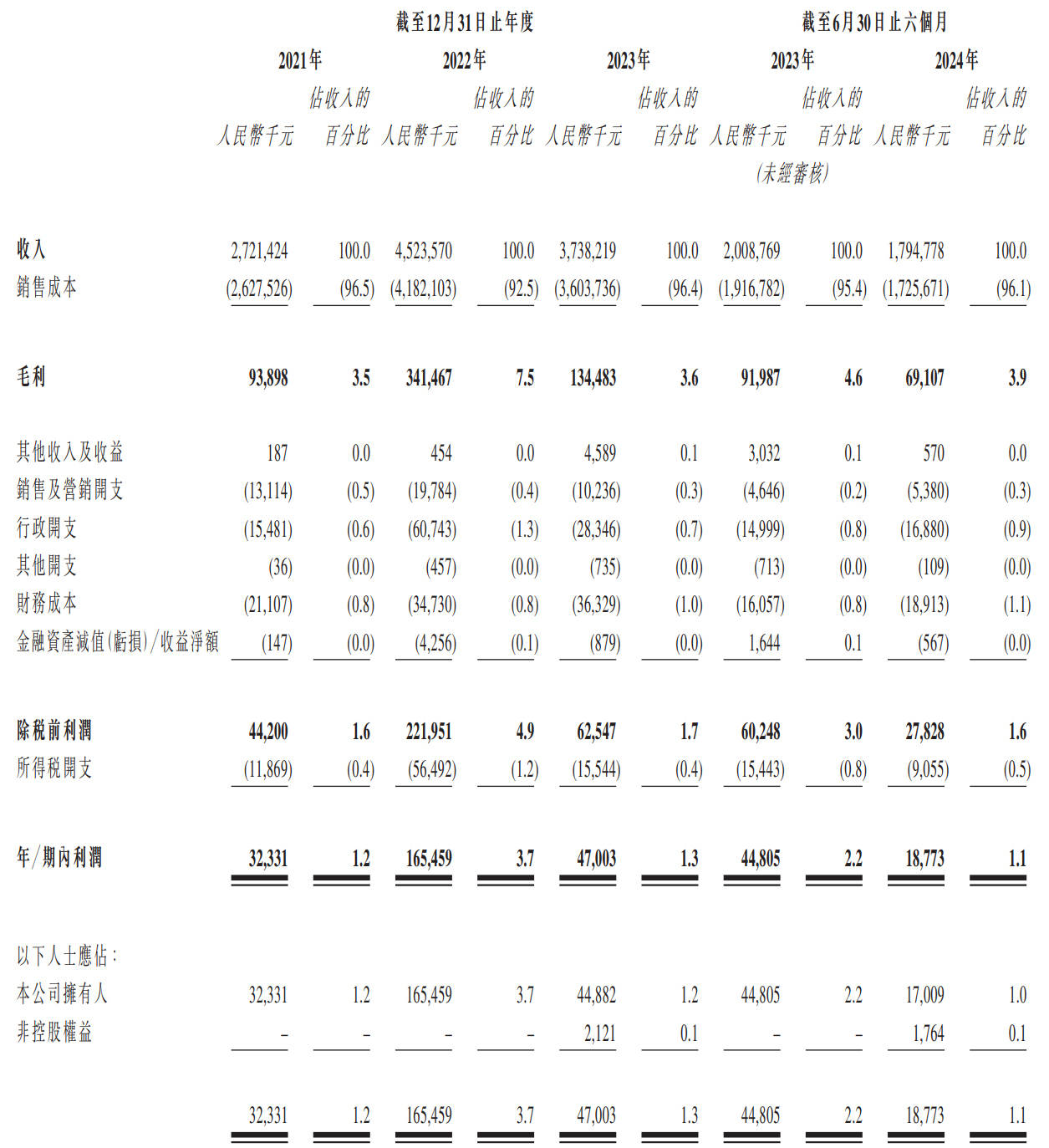 招股書顯示,干元微珂2021年、2022年、2023年營收分別為27.21億元、45.24億元、37.38億元;毛利分別為9389.8萬元、3.42億元、1.34億元;毛利率分別為3.5%、7.5%、3.6%。