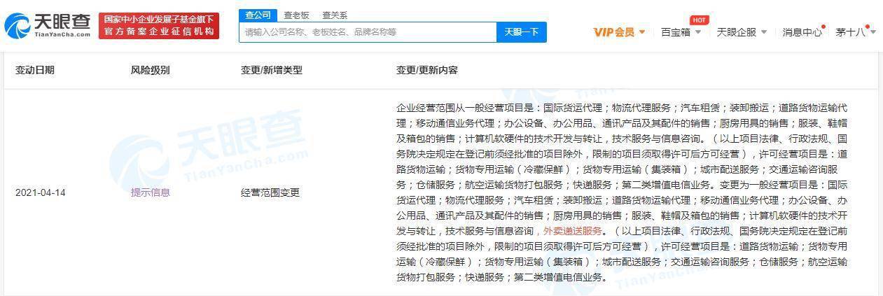 順豐關聯公司經營范圍新增外賣遞送服務 此前已推出外賣相關平臺