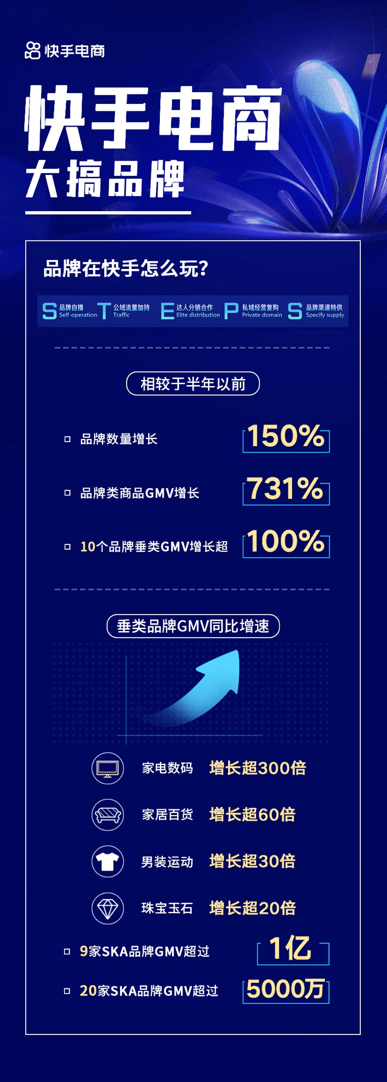 根據大會釋放的信息,在「STEPS」方法論(即自播、分銷、私域、投流、反向定制商品)的指導下,品牌商家在快手生態里迅速找到經營方法,9 家 SKA 品牌 GMV 超過 1 億,20 家 SKA 品牌 GMV 超過 5000 萬。