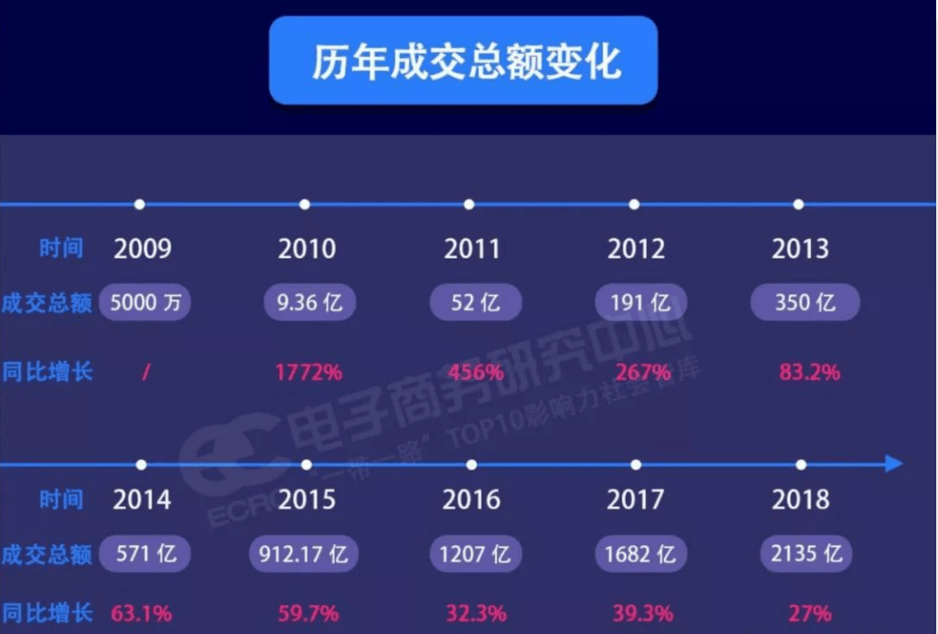 在爆發(fā)式增長的2010和2011年,雙十一成交總額增幅分別高達(dá)11772%和456%。之后進(jìn)入穩(wěn)定期,這個數(shù)字也能保持在30%以上。2016年,規(guī)模增速險些跌破30%,但次年又強勢反彈,這讓很多人以為雙十一的疲軟只是假象,未來仍會保持高速增長。