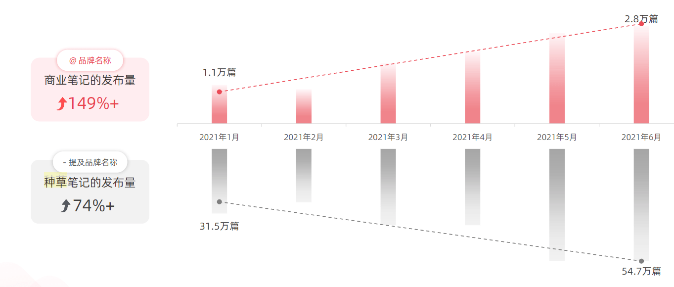 小紅書的種草,是以社交、興趣消費為基礎(chǔ)的,和平臺進(jìn)行商業(yè)合作的種草筆記才是主流,才能獲得更多流量傾斜。新紅數(shù)據(jù)的報告顯示,今年6月份,小紅書商業(yè)合作筆記發(fā)布量為2.8萬篇,較1月份暴漲149%,提到品牌關(guān)鍵詞的種草筆記則高達(dá)54.7萬篇,較年初大漲74%。
