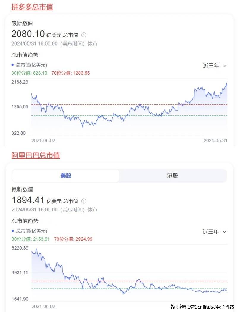 前段時間,拼多多一季度財報發布后,市值繼去年11月末后,再度超越阿里。截至發稿,拼多多最新市值超2080億美元(約1.51萬億人民幣),阿里最新市值1894億美元(約1.37萬億人民幣)。