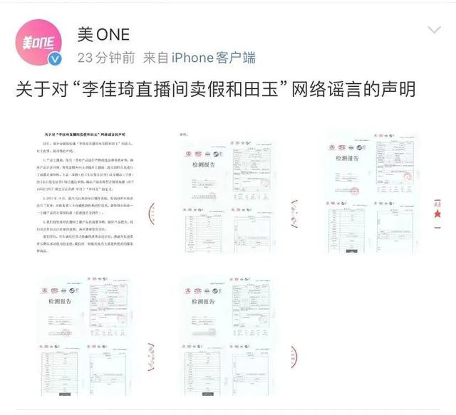 17日, 美ONE發(fā)布關于對“李佳琦直播間賣假和田玉”網(wǎng)絡謠言的聲明。聲明中指出,產品上播前,公司對產品進行嚴格的選品和資質審核,確保產品合法合規(guī)。2023年10月,公司關注到部分自媒體發(fā)帖,即刻對所審資質進行了復審,并聯(lián)系第三方權威檢測機構進行送檢,最終得出結論為上播產品符合國家標準。