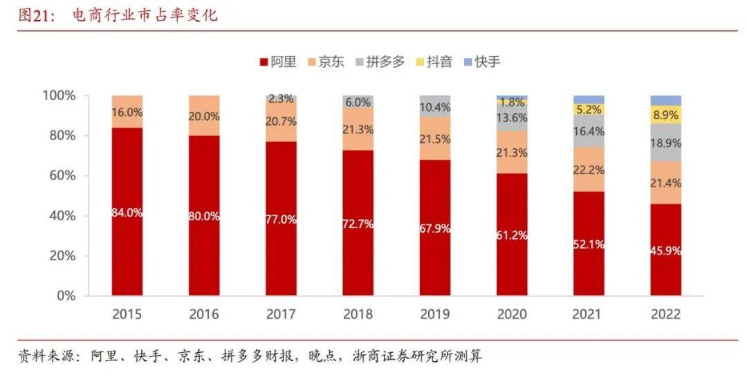 2015年,阿里和京東把控中國電商話語權(quán),據(jù)浙商證券研究所測(cè)算,二者市場(chǎng)份額呈“八二分”格局。也就在這一年,拼多多正式成立,看似牢不可破的電商格局,被拼多多撕開了一個(gè)口子。