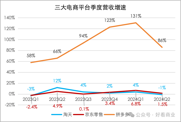 以今年上半年為例,京東零售業務營收4839億元,同比增長3.9%。淘天上半年營收2066億元,同比增長0.8%。兩大平臺上半年的增速均不及國內電商大盤。據國家統計局的數據,今年1-6月,全國網上零售額同比增長9.8%,其中實物商品網上零售額59596億元,同比增8.8%。