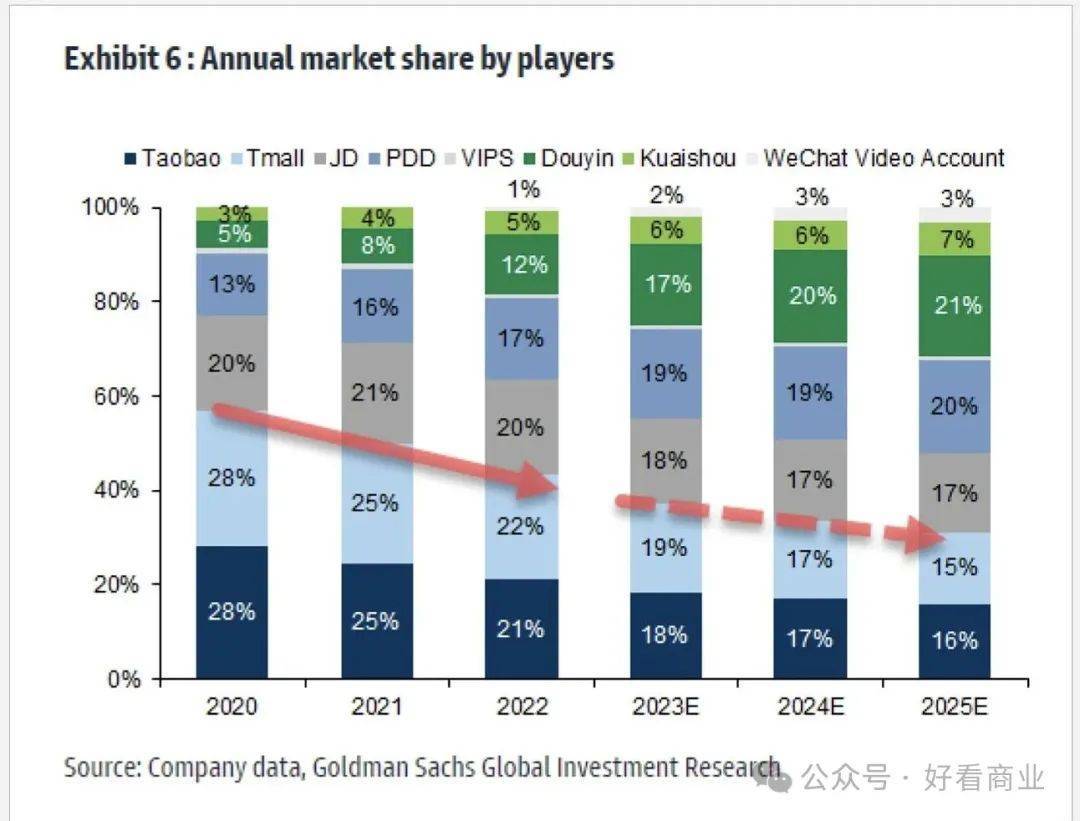 據高盛的報告,2023-2025年,拼多多、抖音、快手的市場份額都將持續壯大,而淘天、京東的份額會遭到進一步擠壓。