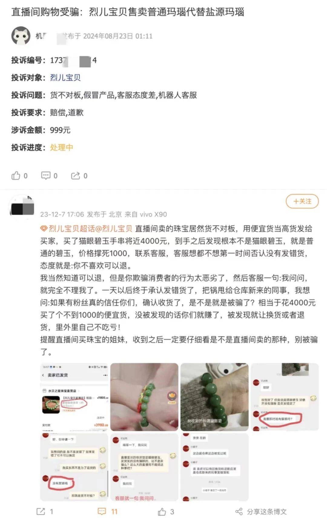 另一邊,有消費者在黑貓平臺投訴,自己在“烈兒寶貝”直播間購物被騙,“烈兒寶貝”售賣普通瑪瑙代替鹽源瑪瑙。類似的情況,在微博上也有網友反映。