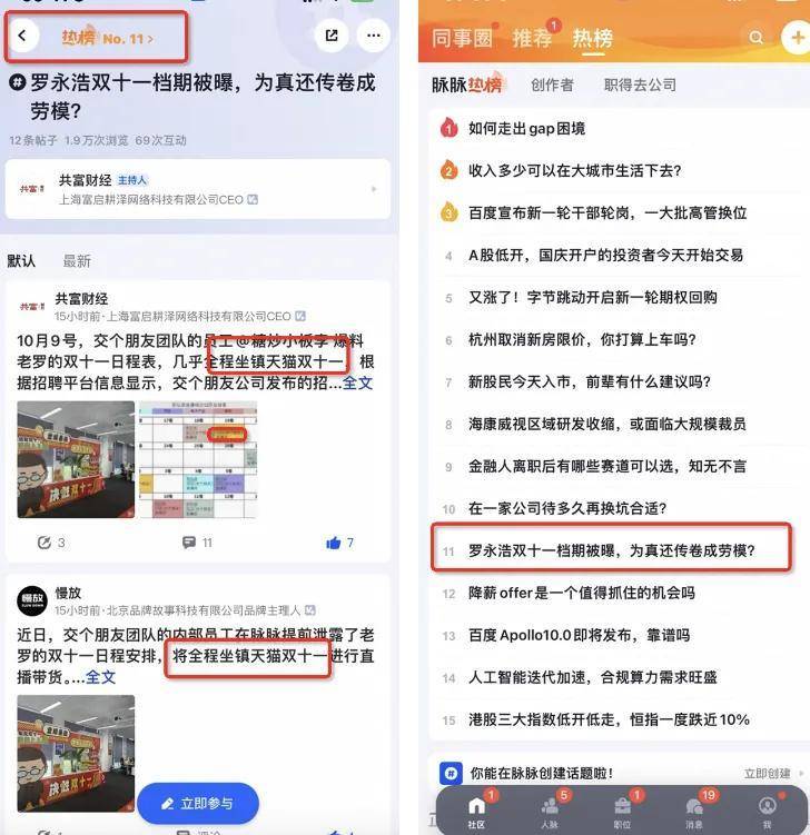 無獨有偶,交個朋友員工也在脈脈爆出羅永浩雙11排班表,在脈脈引起激烈反響,沖上脈脈熱搜第11名。圈內人都在感慨:隨著今年小楊哥、辛巴、東北雨姐、董宇輝相繼陷入各種風波,羅永浩竟然是目前最優質的超頭之一,李佳琦和老羅這波押寶天貓雙11,代表了頭部直播間的戰略選擇,毫無保留地重倉天貓雙11。