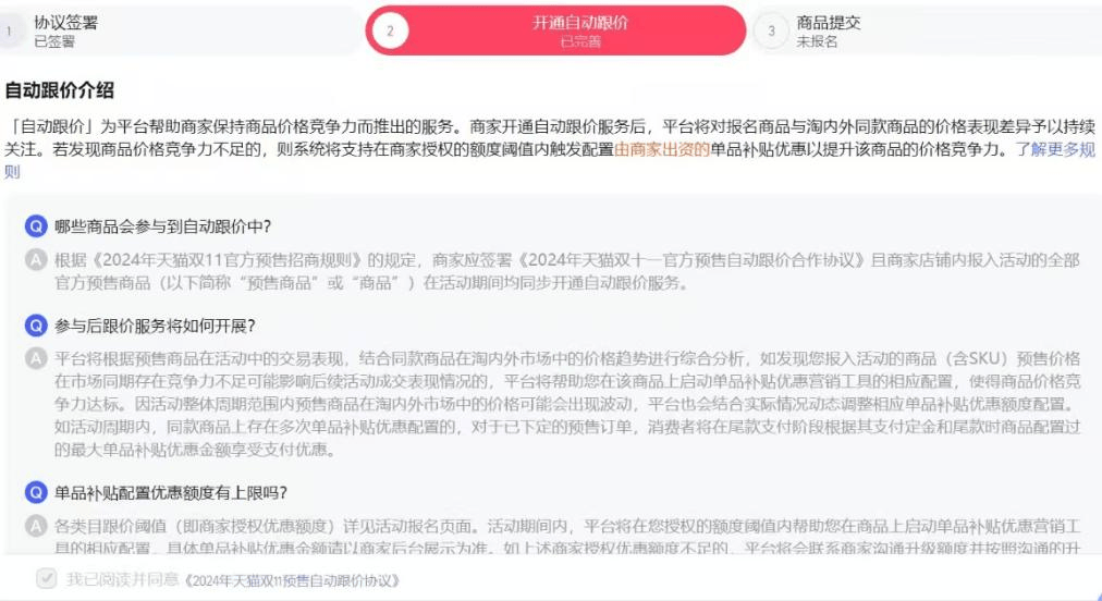 此外,天貓規定報名預售的商家須簽署《2024年天貓雙十一官方預售自動跟價合作協議》,并且協議簽署后不能退出。自動跟價指的是平臺會實時監測淘內外同款商品的價格表現,如果發現商品預售價格競爭力不足的話,平臺將啟動單品補貼優惠營銷工具,保證商品價格具有競爭力。