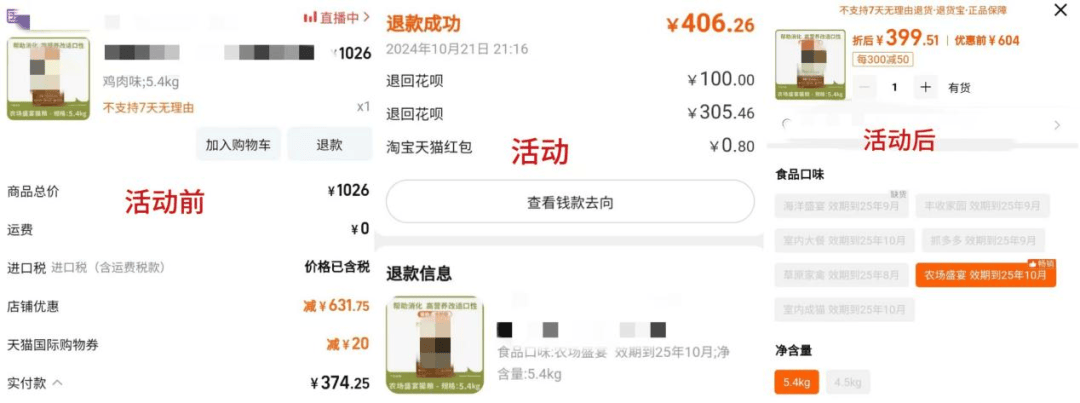 參加了雙11預售活動的消費者張文向「市象」反映,自己在雙11期間遇到了預售商品的價格比直接購買還要高的情況。“我在一家寵物食品旗艦店購買了一款貓糧,14號直接購買的價格是374.25元,并且隔天就發貨了,但通過預售鏈接購買則需要支付100元定金和305元尾款,總共405元。我在付完尾款并申請退款后,再次查看這款商品,發現價格已經調整為399元,預售價格仍然比這個價格要高。”